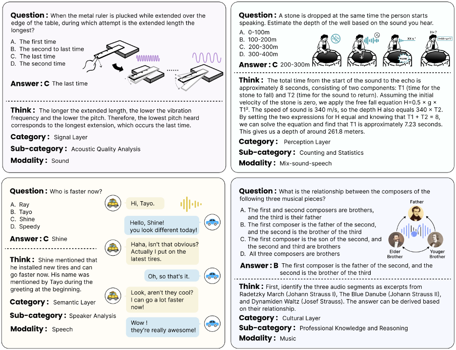 简单来说,它是一个包含1000个高质量问题的音频理解评估基准,每个问题都要求模型具备多步骤的深度推理能力。