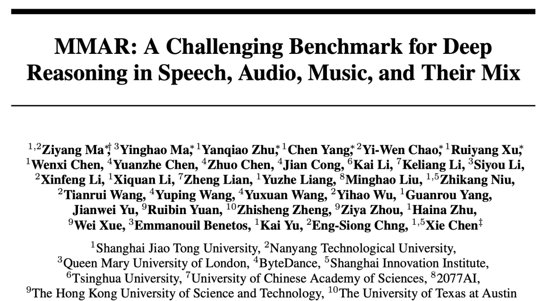 MMAR全称是:A Challenging Benchmark for Deep Reasoning in Speech, Audio, Music, and Their Mix。