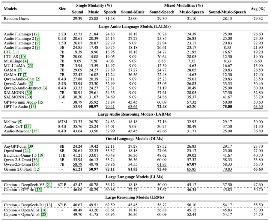 研究团队一口气测试了30款音频相关模型,包括 LALMs(大型音频语言模型)、LARMs(大型音频推理模型)、OLMs(全能型多模态模型)等等。结果让人有点哭笑不得: