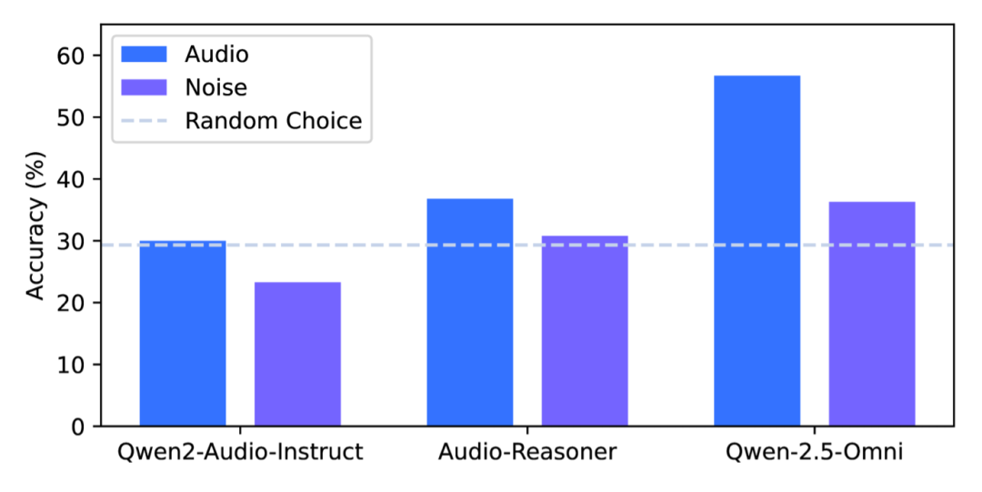 结果发现,模型性能都大幅下降,证明它们确实在“听”音频,而不是靠文本先验瞎猜。不过,Qwen-2.5-Omni在噪声输入下依然略高于随机猜测 ,暴露出潜在的语言先验偏差问题。