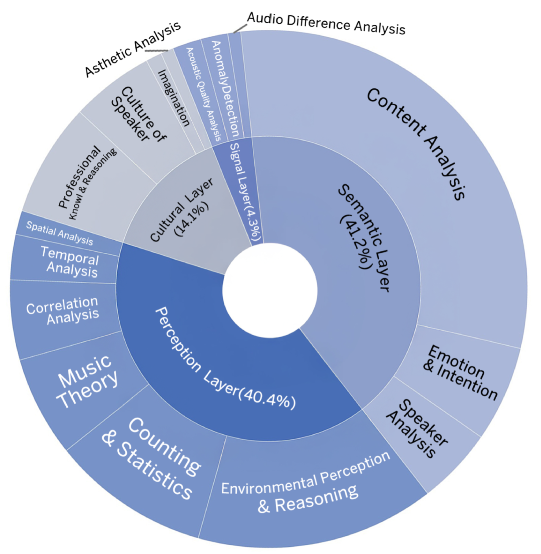 而且,每个任务都需要多步推理,其中一些任务甚至需要极富挑战性的感知技能和领域特定知识,音频包含真实场景的语音、音乐、环境事件声音和他们的混合,相当的有难度。