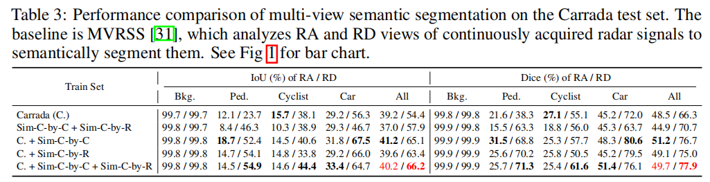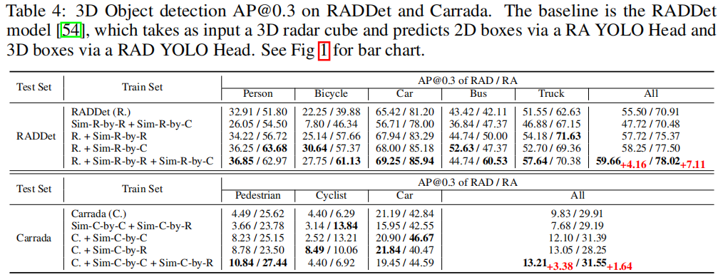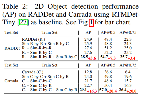 为了排除场景多样性导致的增益,只在RADDet和Carrada的训练集场景上生成仿真数据,数据量大约为原始数据的两倍。
