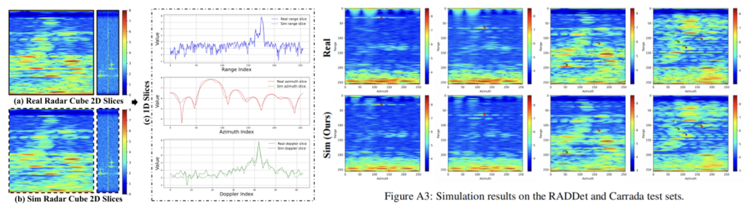 下图则展示了仿真结果和真实雷达立方体的比较,新方法的仿真结果与真实雷达立方体高度相似(包括噪声区域)。