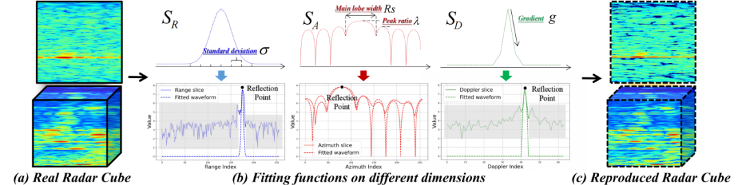 进一步地,团队提出了一种基于波形参数的雷达属性表示方法,通过三维反射波形在不同维度的波形参数{σ, g, Rs, λ}来直观地表征雷达属性。