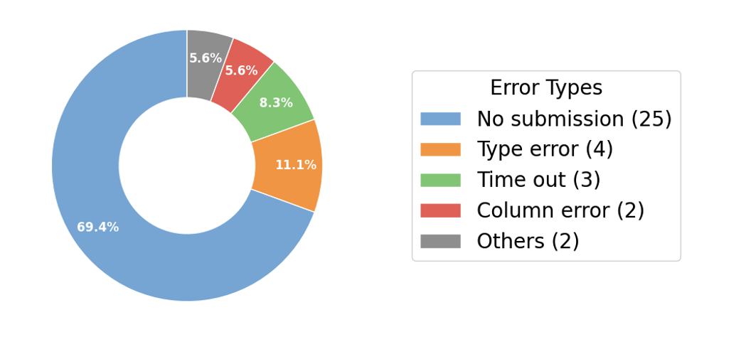 此外,Agent们在任务中还会犯下各种低级错误,导致提交结果无效。其中最主要的原因是根本没有生成提交文件,这往往源于模型的“幻觉”。