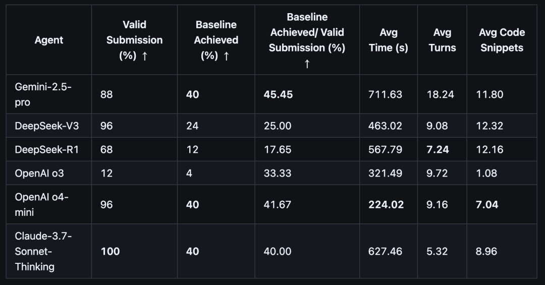 具体来看,Gemini-2.5-Pro、OpenAI o4-mini和Claude-3.7-Sonnet-Thinking表现位列第一梯队,但其“基准达成率”(即结果达到或超过人类基准)也仅为40%。