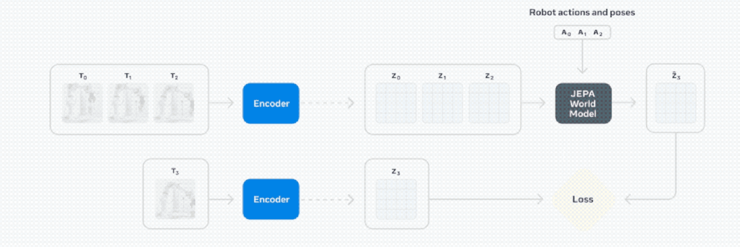 V-JEPA 2采用联合嵌入预测架构(JEPA),主要包含两个组件:编码器和预测器。