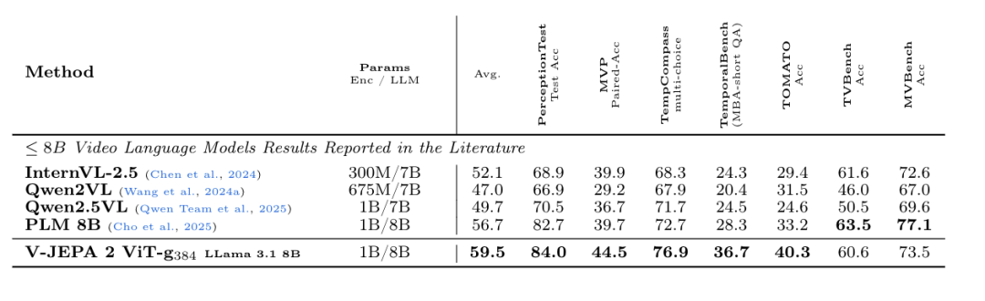 此外,在将V-JEPA 2与大型语言模型对齐后,团队在8B参数规模下多个视频问答任务中展示了当前最佳性能(例如,在PerceptionTest上达到84.0,在TempCompass上达到76.9)。
