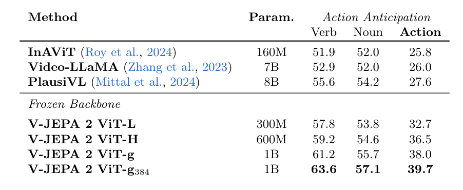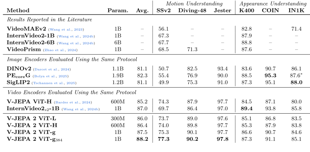经过训练后,V-JEPA 2在运动理解方面取得了优异性能(在Something-Something v2上达到77.3的 top-1准确率),并在人类动作预测方面达到了当前最佳水平(在Epic-Kitchens-100上达到39.7的recall-at-5),超越了以往的任务特定模型。