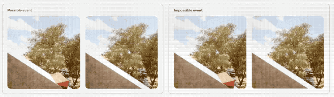 团队通过一个游戏引擎生成视频对,其中两个视频在某个点之前完全相同,然后其中一个视频发生物理破坏事件。