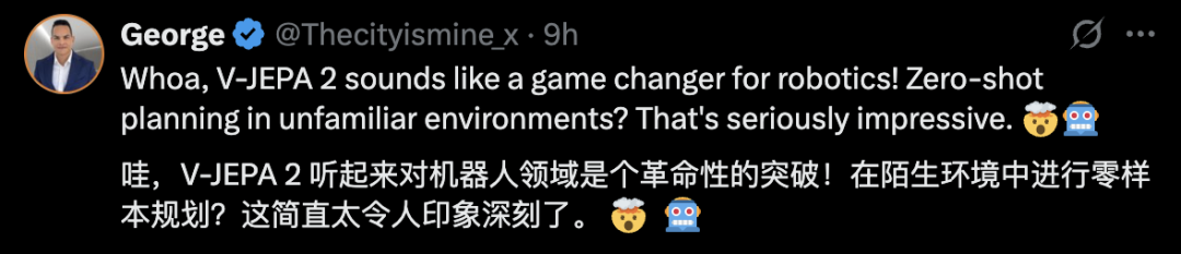 V-JEPA 2一发布就引起了一片好评,甚至有网友表示:这是机器人领域的革命性突破!