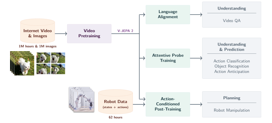 V-JEPA 2采用自监督学习框架,利用超过100万小时的互联网视频和图像数据进行预训练,不依赖语言监督,证明纯视觉自监督学习可以达到顶尖表现。