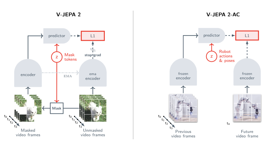V-JEPA 2的训练涉及两个阶段:先是无动作预训练(下图左侧),然后是额外的动作条件训练(下图右侧)。