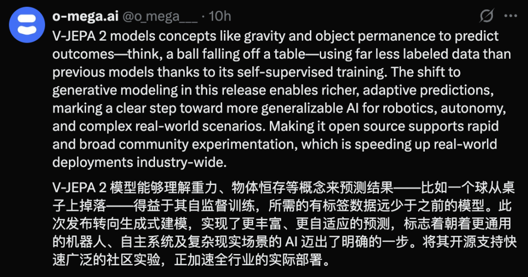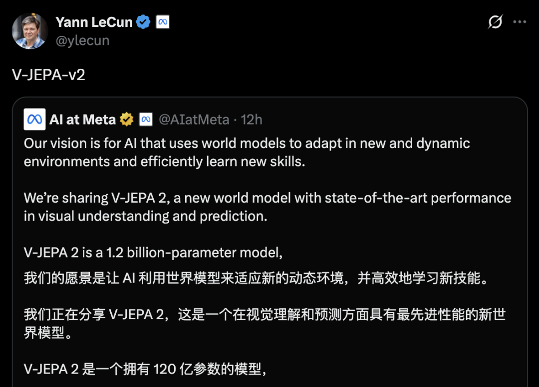 Meta开源发布V-JEPA 2世界模型:一个能像人类一样理解物理世界的AI模型。