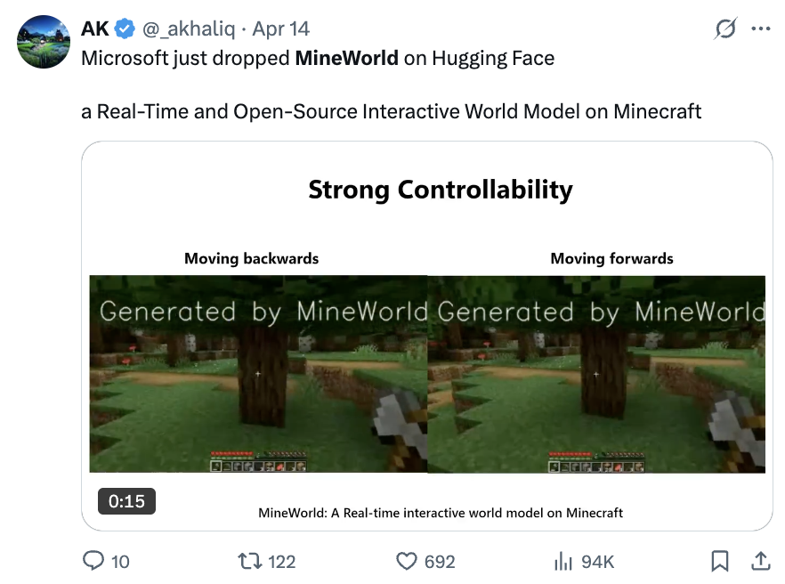 值得一提的是,前段时间在X上火了的一款基于Minecraft的交互式自回归世界模型——MineWorld,也是这个微软研究院的团队做的。