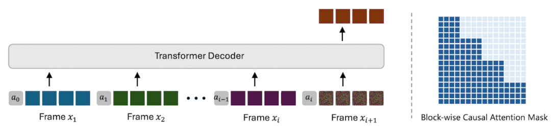具体来说,NFD的架构包含一个将原始视觉信号转换为Token的Tokenizer,以及生成这些Token的基于扩散的Transformer模型。在Transformer内,研究人员使用了块状因果注意力机制,结合帧内的双向注意力和帧间的因果依赖,高效建模时空依赖性。