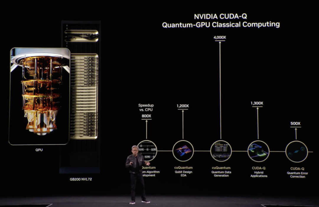 CUDA-Q已在Grace Blackwell上可用,通过英伟达的GB200 NVL72超算,CUDA-Q可以将开发速度提高1300倍。