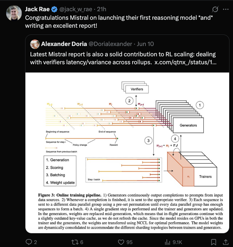 不过Jack Rae向媒体证实将离开谷歌,还没有公开承认,最新的推文停留在对Mistral首个推理模型的祝贺上。