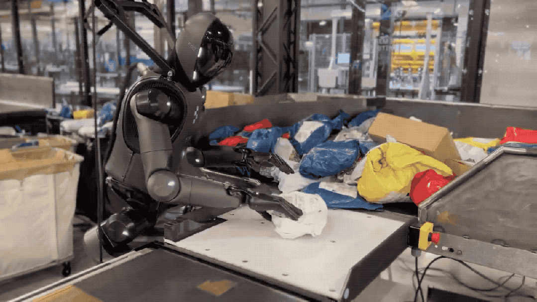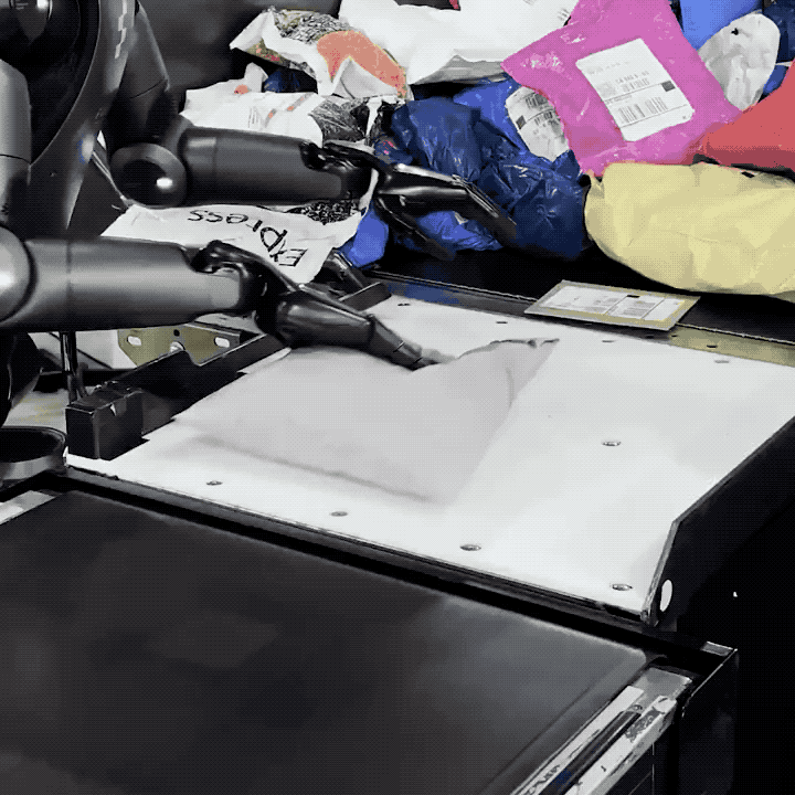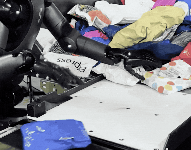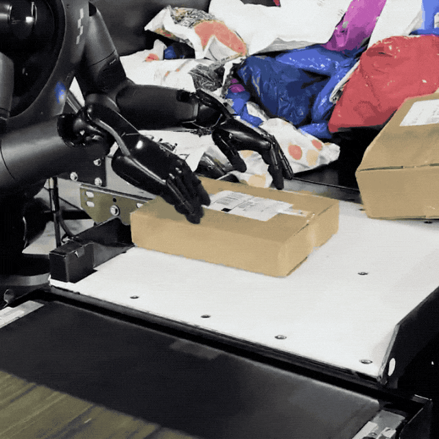 针对不同形态包裹,Helix采取即时调整抓取策略解决,例如碰到纸盒就双手上下一翻,碰到信封则一只手扶住,另一只手轻轻捏住边缘翻转。