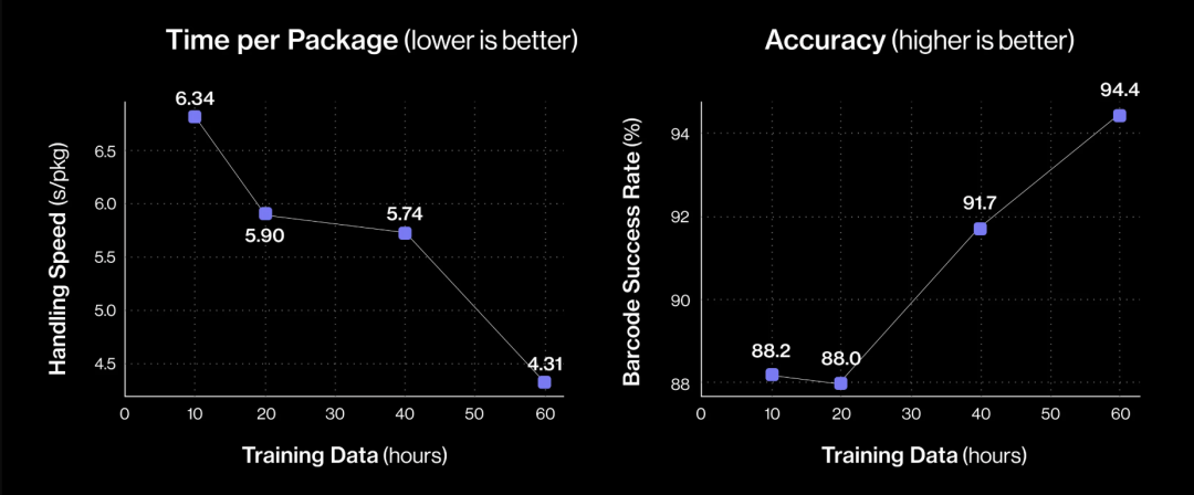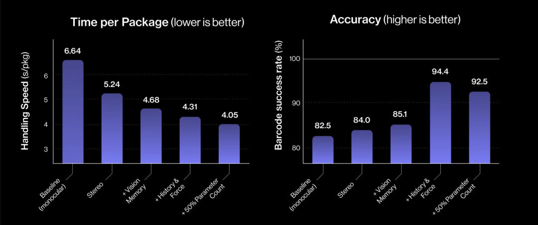 值得注意的是,机器人还会轻轻拍打塑料包装以抚平起皱的货物条形码,这是机器人自己从演示中学习到的自适应行为,侧面凸显出端到端学习的优势。