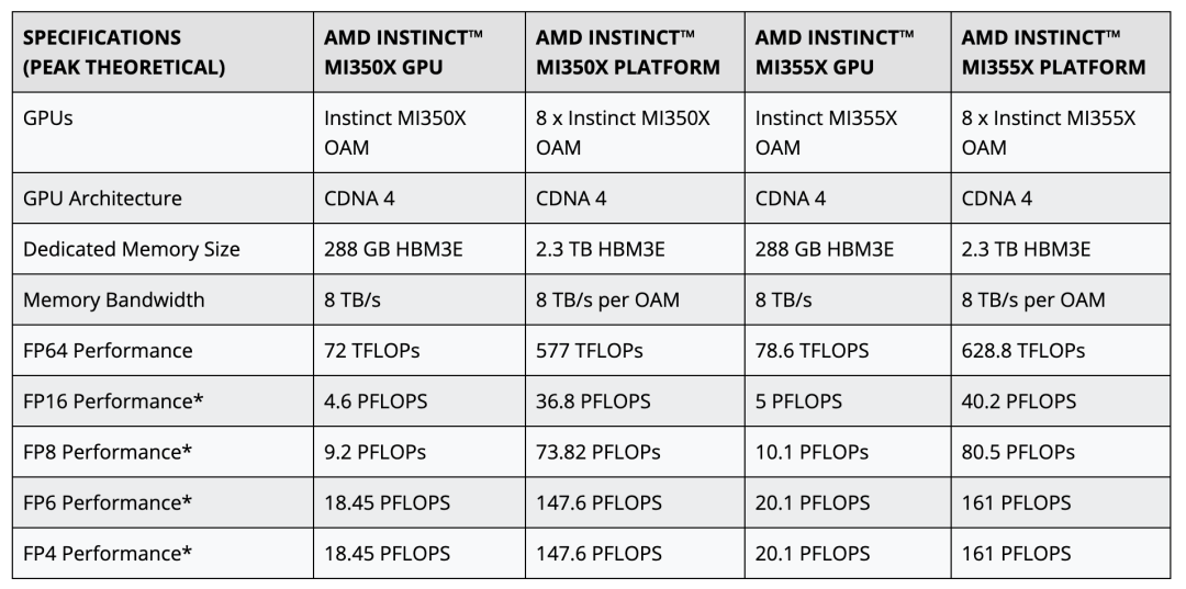 值得注意的是,MI350系列上,FP6性能的运算可以以FP4的速率运行,这被AMD认为是一个差异化特征。