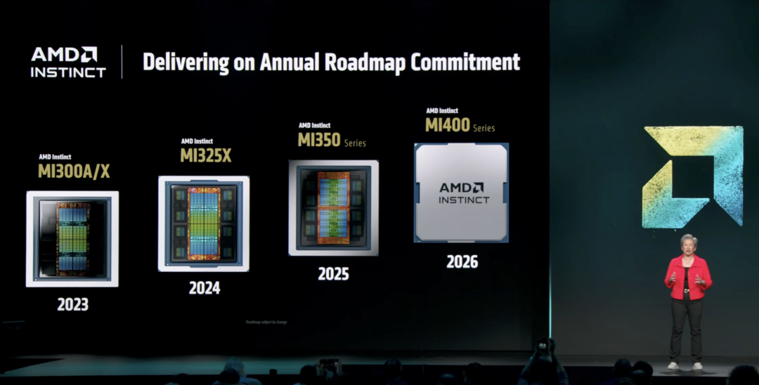 发布MI350系列的同时,苏妈也公布了AMD在AI芯片上新的路线图。