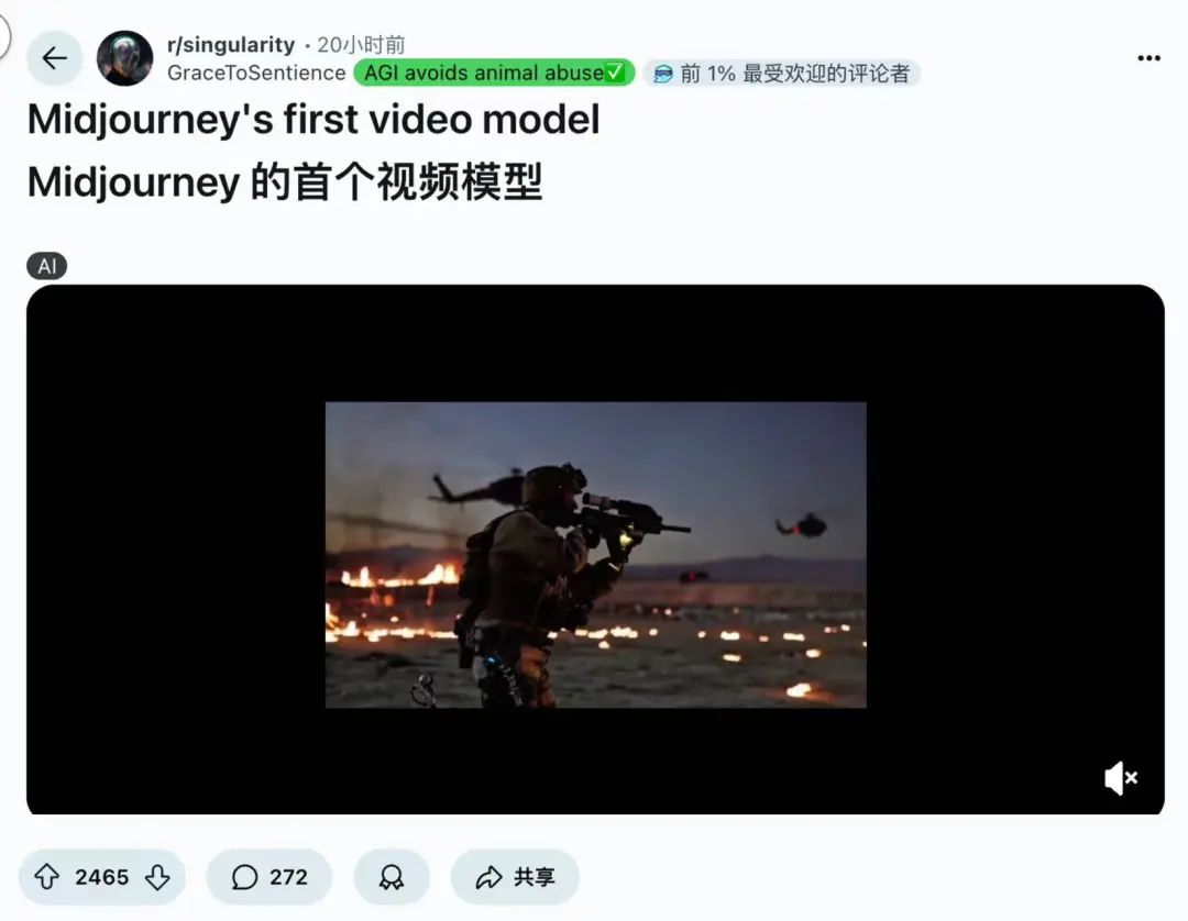 [1]https://www.reddit.com/r/singularity/comments/1lbwaek/midjourneys_first_video_model/