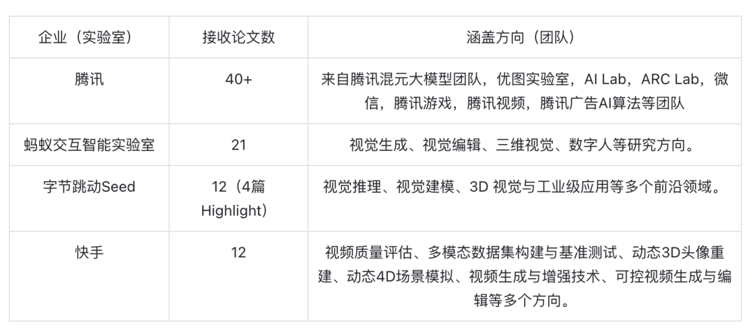 首先最直接的就是论文接收数,从目前公开的信息来看,企业的接收数都不少,方向也很多元。