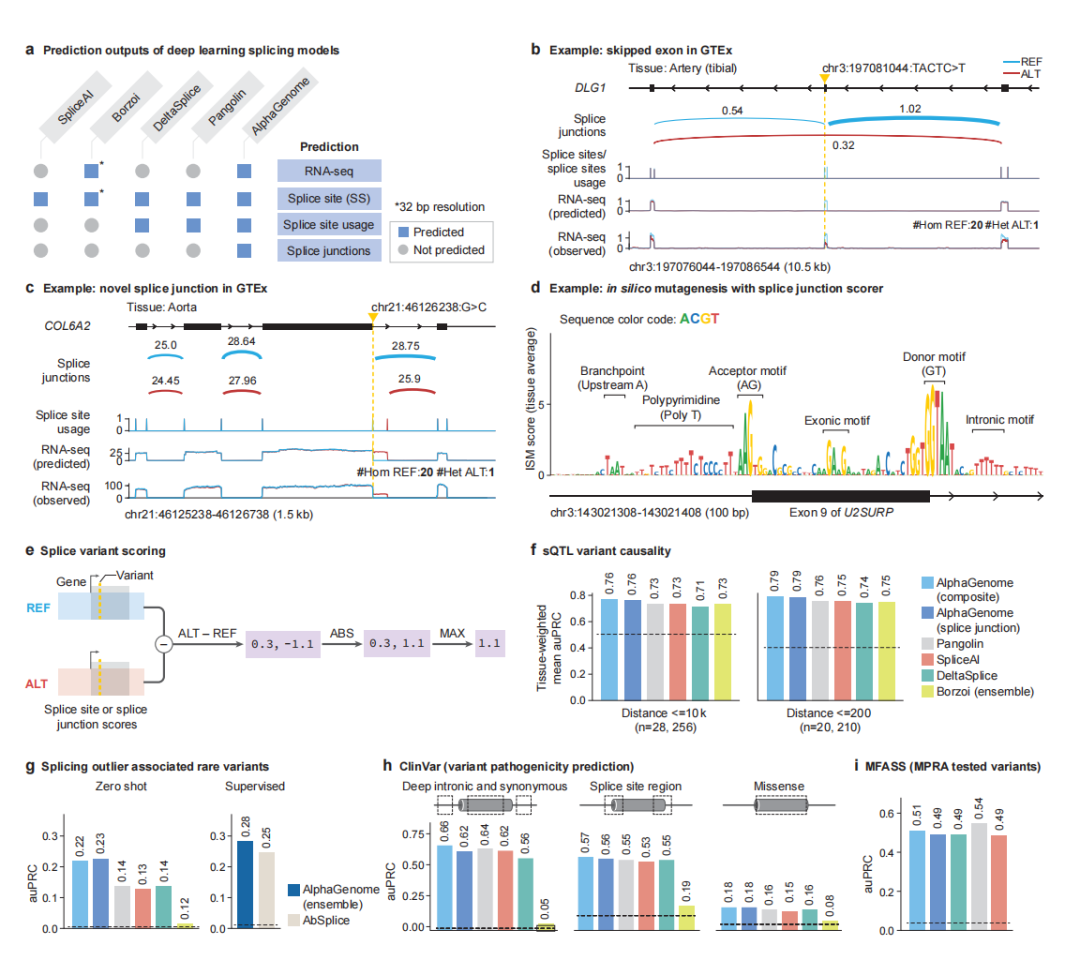 基于AlphaGenome的多维度剪接预测,实验团队为每个预测模态设计了定制的变异评分策略,并将单个评分求和,以综合考量变异预测效应。