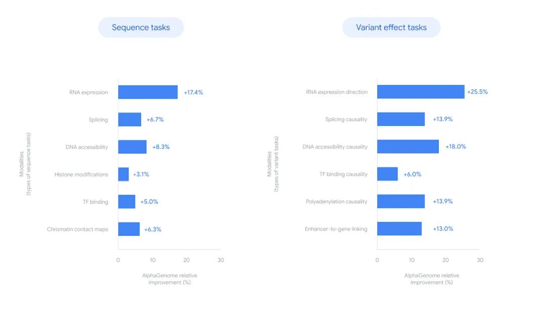 AlphaGenome在其中22项都保持领先,其中与另一种多模态序列模型Borzoi3相比,更是在细胞类型特异性的LFC预测上,表现出+17.4%的相对改进。