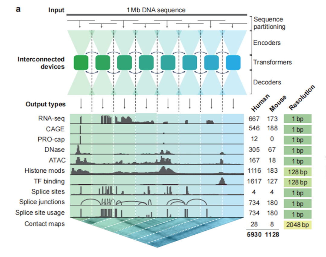 通过8个互相连接的张量处理单元,实现对完整碱基对的分辨率训练,然后利用编码器跳跃连接,在上采样阶段恢复序列的1bp分辨率。
