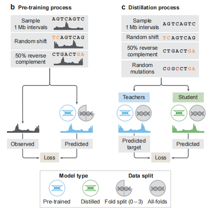 预训练:首先利用观测数据生成折叠特异性模型和全折叠模型,前者采用4折交叉验证方法进行训练,防止过拟合,后者在基因组的全部可用区间上进行训练,并视作后续蒸馏的教师模型。