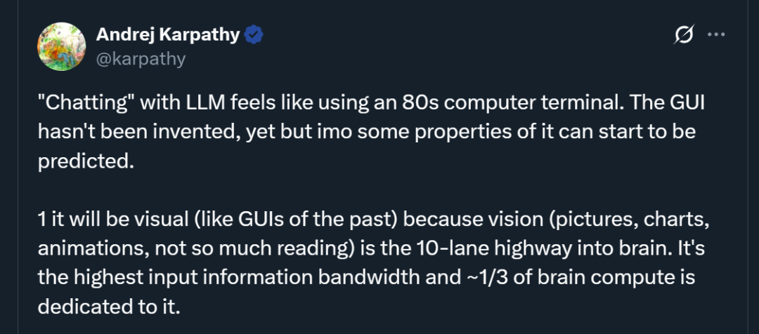 在他看来,如今和大语言模型(LLM)聊天就像在使用80年代的电脑终端,还没有用上图形用户界面(GUI)。