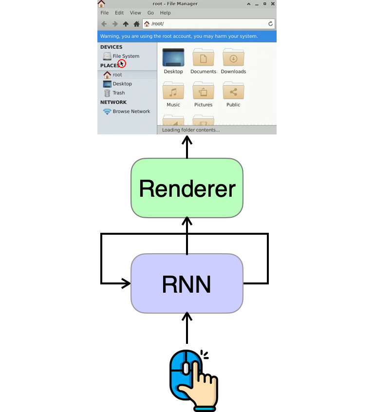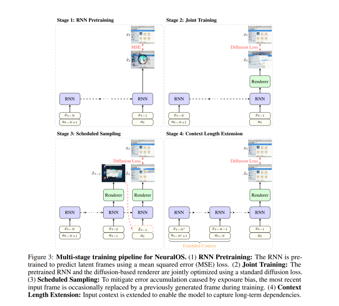 然后经过RNN预训练——RNN+Renderer联合训练——计划采样——将RNN输入的上下文序列加长这一训练流程后,NeuralOS终于学会了根据之前的帧和用户输入(鼠标、键盘)来预测下一帧屏幕图像。