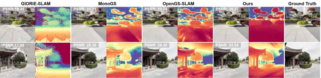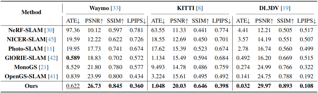 在Waymo、KITTI及DL3DV三大户外基准测试中,S3PO-GS展现出显著优势:其跟踪精度超越所有现有3DGS-SLAM方法,尤其在DL3DV场景中将误差降低77.3%;同时在新视角合成任务中刷新SOTA纪录,Waymo数据集PSNR指标达到26.73,为无界户外场景的实时高精度重建树立了新标杆。