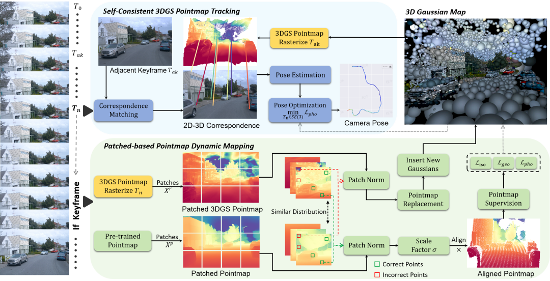 其次设计动态建图机制,创新性提出基于局部patch的尺度对齐算法,动态校准预训练点云图(MASt3R)与3DGS场景的尺度参数,解决尺度模糊问题;