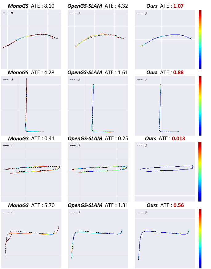 如下图所示在剧烈视角变动场景下,本方案展现出卓越的抗视角剧变能力,位姿追踪稳定性显著超越现有3DGS SLAM方法。