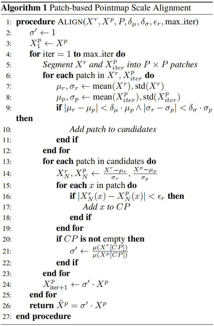 首先实施基于局部patch的尺度对齐——通过块相似性分析筛选空间分布一致的高置信度点,建立 与 的局部映射关系,求解最优缩放因子 将 精准映射至场景尺度空间;