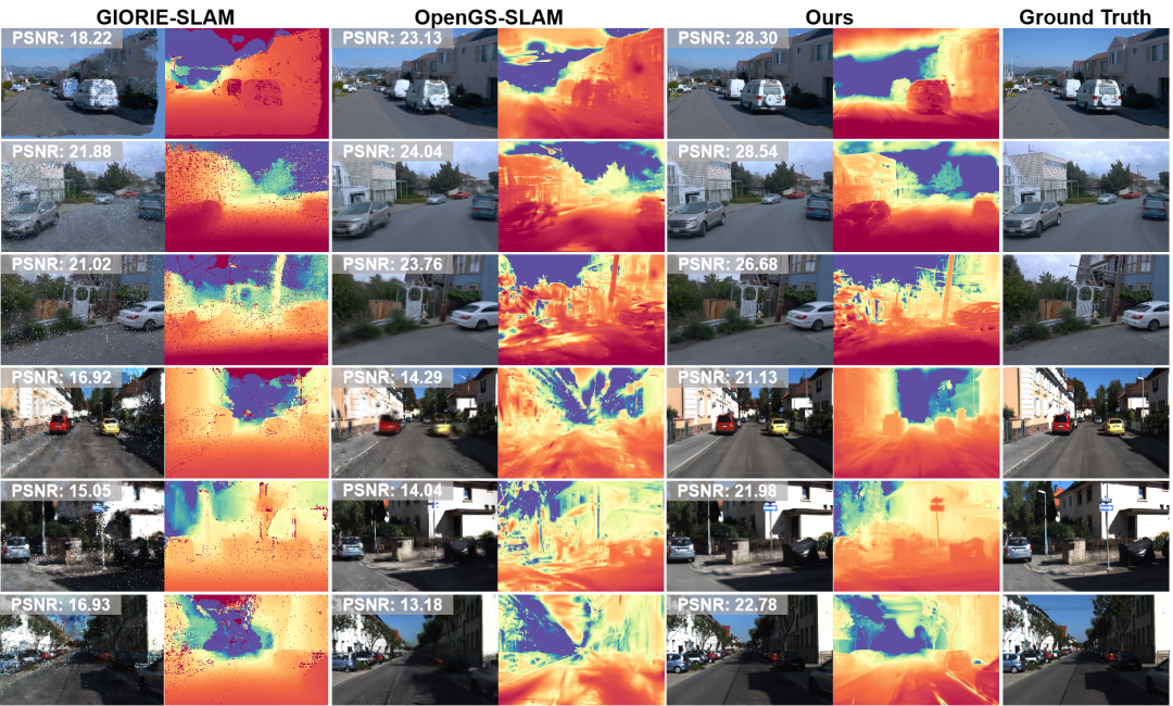 如下图所示,本方法渲染的高保真图像可精准捕捉车辆纹理、街道细节与建筑结构。在深度变化复杂的区域(如树枝分叉处、路边车辆堆叠场景),渲染的深度图精度显著提升。