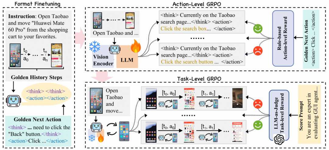 通过包括格式微调、动作级GRPO训练和任务级GRPO训练在内的三阶段训练过程,克服了以往方法仅依赖单一动作预测的局限性。