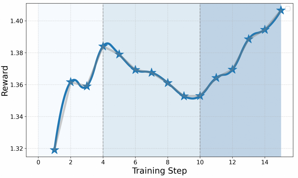 此过程中,Stage 3的奖励分数显示出在前四个训练步骤中稳步增长,表明学习过程是有效的。然而,在步骤5到10之间,奖励有所下降,这可能是由于策略过于激进或探政策的改变导致的不稳定性。最终从步骤11开始,奖励再次上升,这表明策略得到了有效的优化和改进。