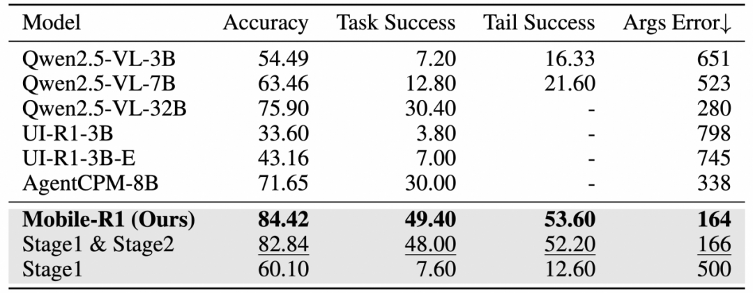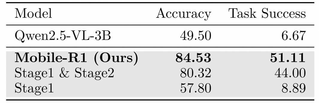 Stage 3的训练进一步增强了Mobile-R1的表现,其成功率比只有阶段1和阶段2训练的模型高出1.4点,这得益于任务级GRPO的有效应用。