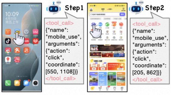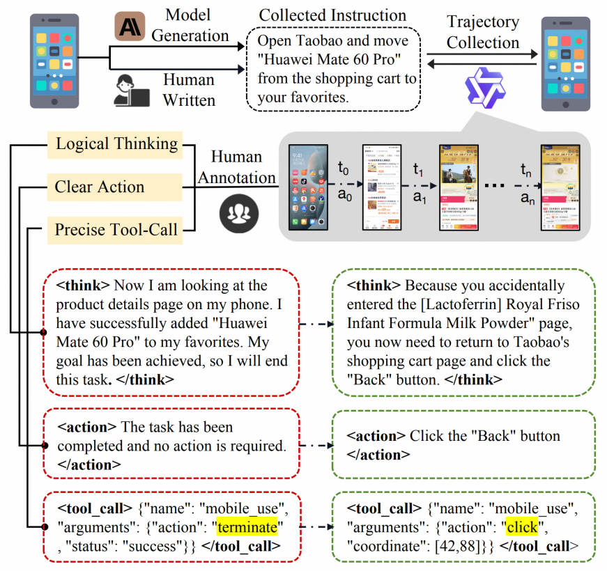 首先,选择了28个中国移动应用程序,通过人工设计和自动生成相结合的方法创建了多样化的任务指令,随后统一经过人工审核,去除了部分不合理指令。在使用Qwen2.5-VL-3B模型执行这些指令后,成功收集了大量动作执行轨迹,轨迹中的每一步都包含模型输出的思考,需要执行的动作以及对应的工具调用。