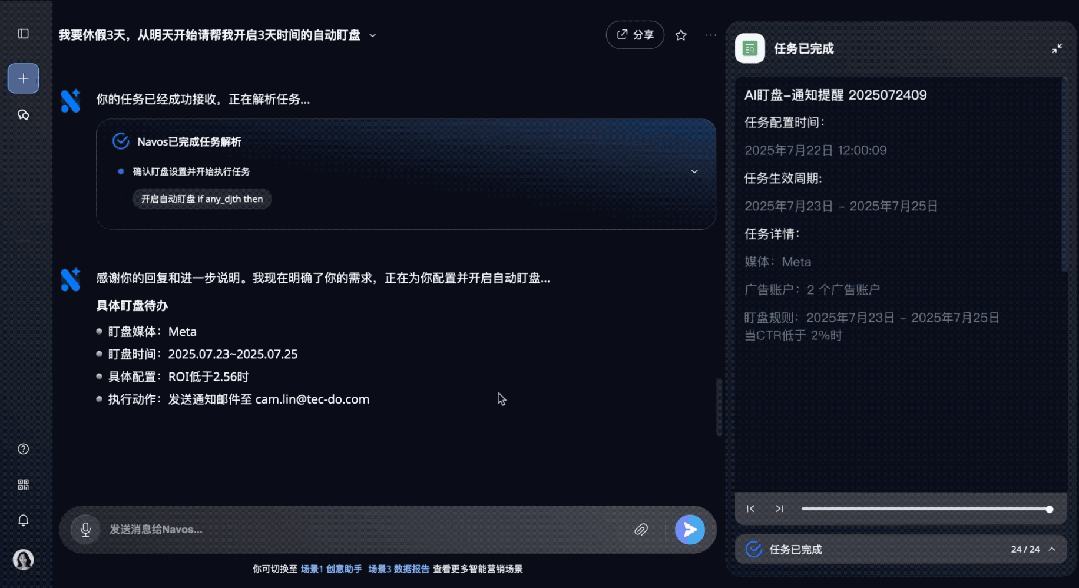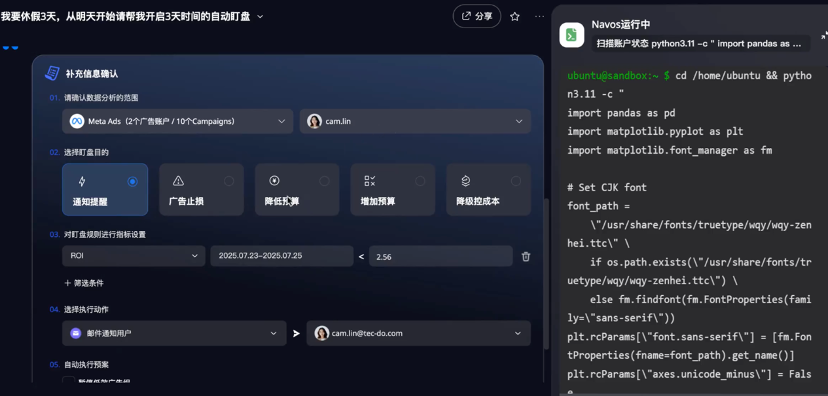 它能够基于历史表现和用户操作习惯智能制定配置方案,并成功执行任务,从而实现智能广告投放与账户管理。