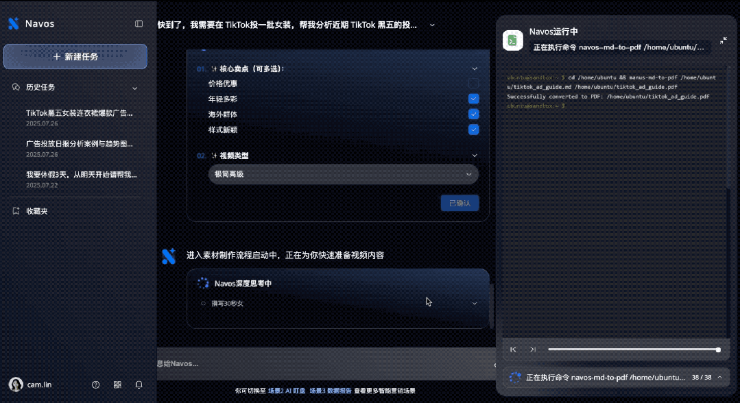 原本一个广告制作人员,想为“黑五”期间的TikTok女装广告制作创意素材,那么这项需求就可以交给Navos。