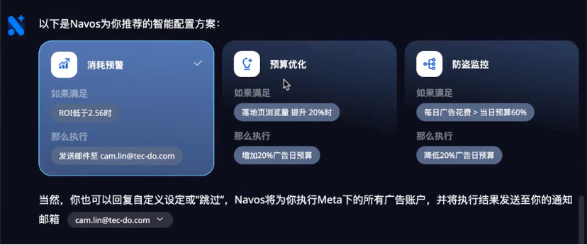 它首先提供了「补充信息确认」,比如当ROI小于2.56时发送邮件提醒,预算增加20%时采取优化动作,广告花费异常时预警等。