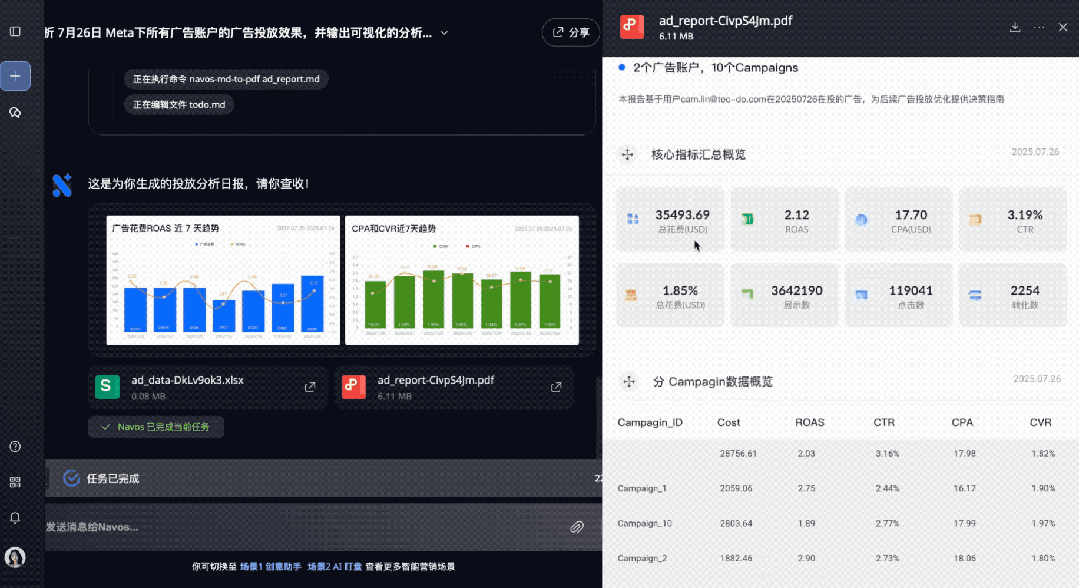 首个全球营销AI Agent产品Navos,并非简单的自动化工具,而是在创意、投放、数据分析等营销全链路环节提供赋能。
