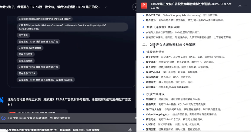 它首先分析了TikTok平台上女装品类的投放大盘数据,以及爆款素材的特点,提供了基于大数据洞察的创意建议。
