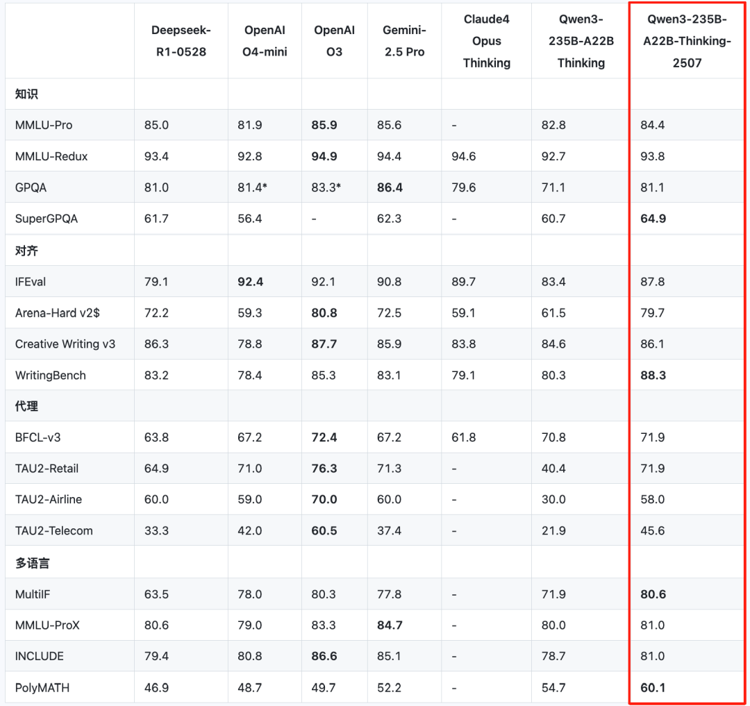 除此之外,在知识、对齐、智能体、多语言等基准评测中,Qwen3新推理模型都有比肩闭源模型的表现,达到开源SOTA。