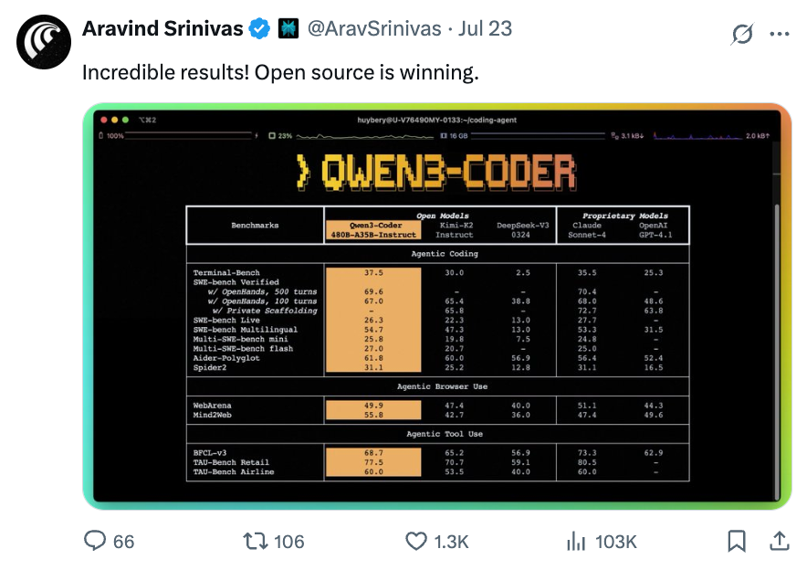 关键是,就在这短短一周里,算上前两天开源的新基础模型Qwen3-235B-A22B-Instruct-2507(非思考版),和Qwen3-Coder,通义千问是完成了一波开源三连。